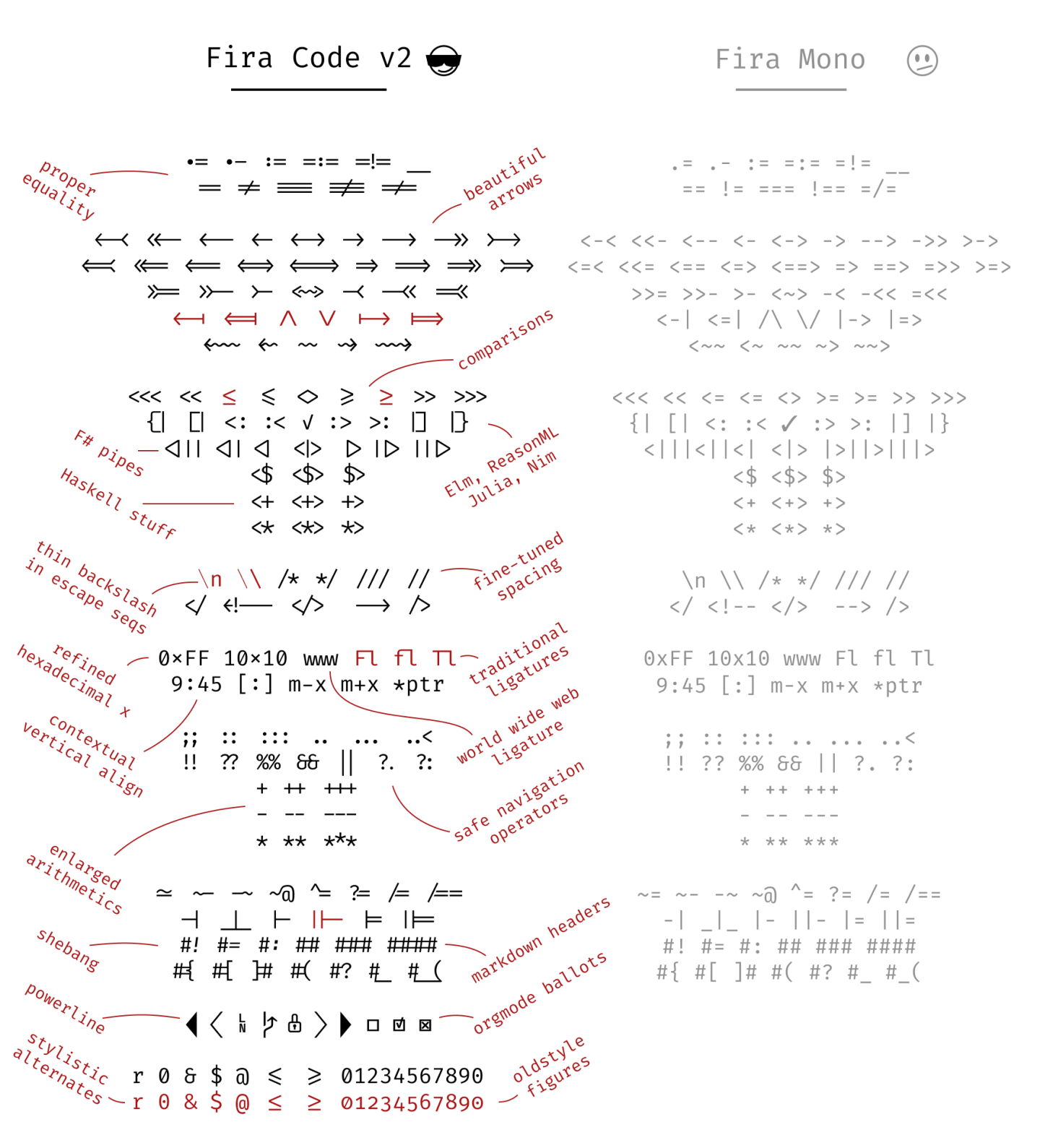 上面的 GIF 动画,为我们展示了字符的连字显示,可以将 >= 显示为两个字符宽度的 ≥ ,可以将 === 显示为 3 个字符宽度的 ≡ ,算是比较有意思的一种体验。用在代码中,可以增加我们代码的可读性。比较遗憾的是,Consolas 字体不支持连字。而所有支持连字的代码字体中,集大成的是 Fira Code,连字效果非常丰富。