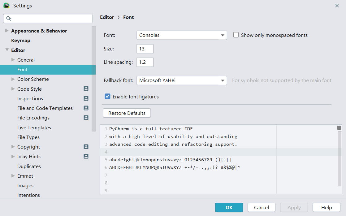 如果使用的是 JetBrains 家的编辑器,2020 年以后版本的编辑器已经自带了 JetBrains Mono 字体,且支持连子,开箱即用,我们只要根据喜好配置第二字体既可。